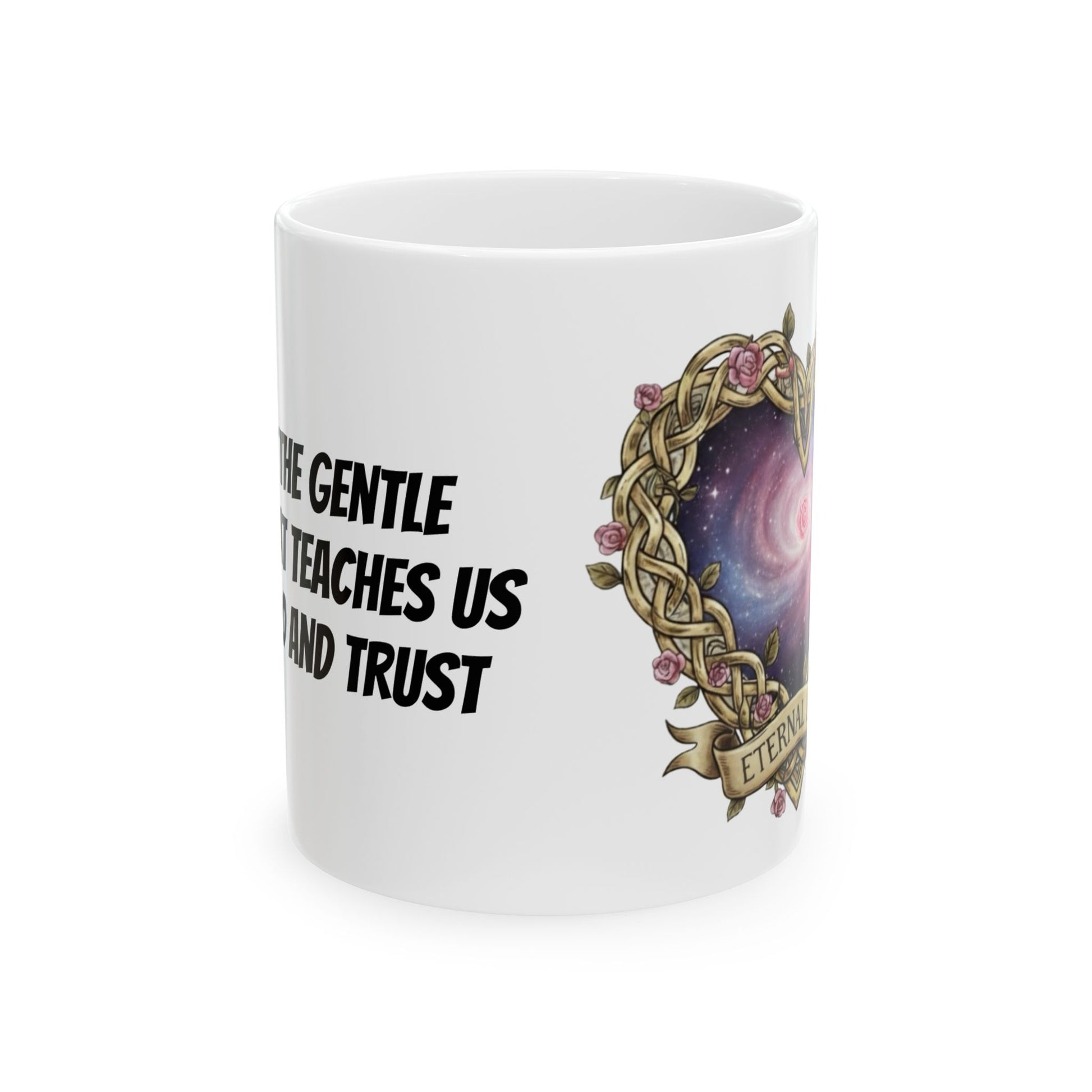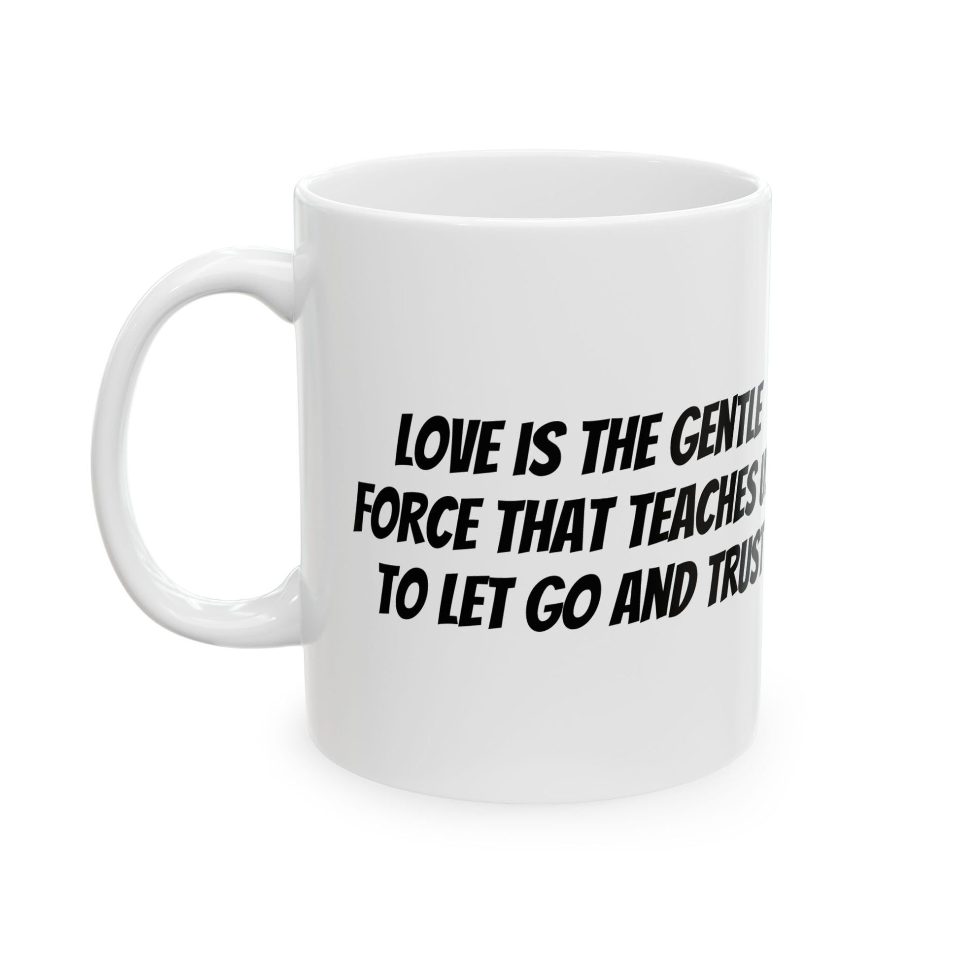 On the opposite side, the mug displays the uplifting message: “Love is the gentle force that teaches us to let go and trust.” Perfect for inspiring reflection, gratitude, and emotional connection with every sip.