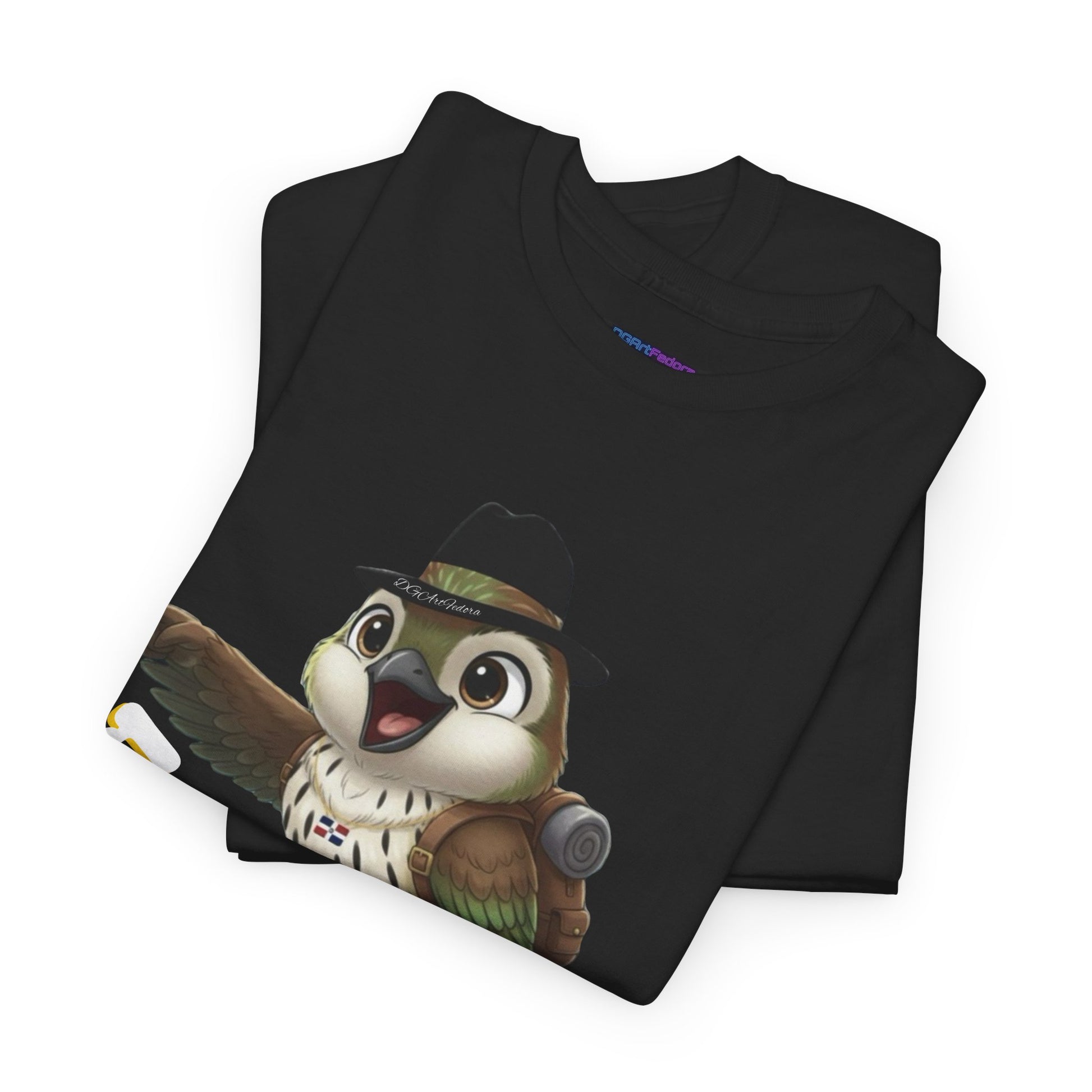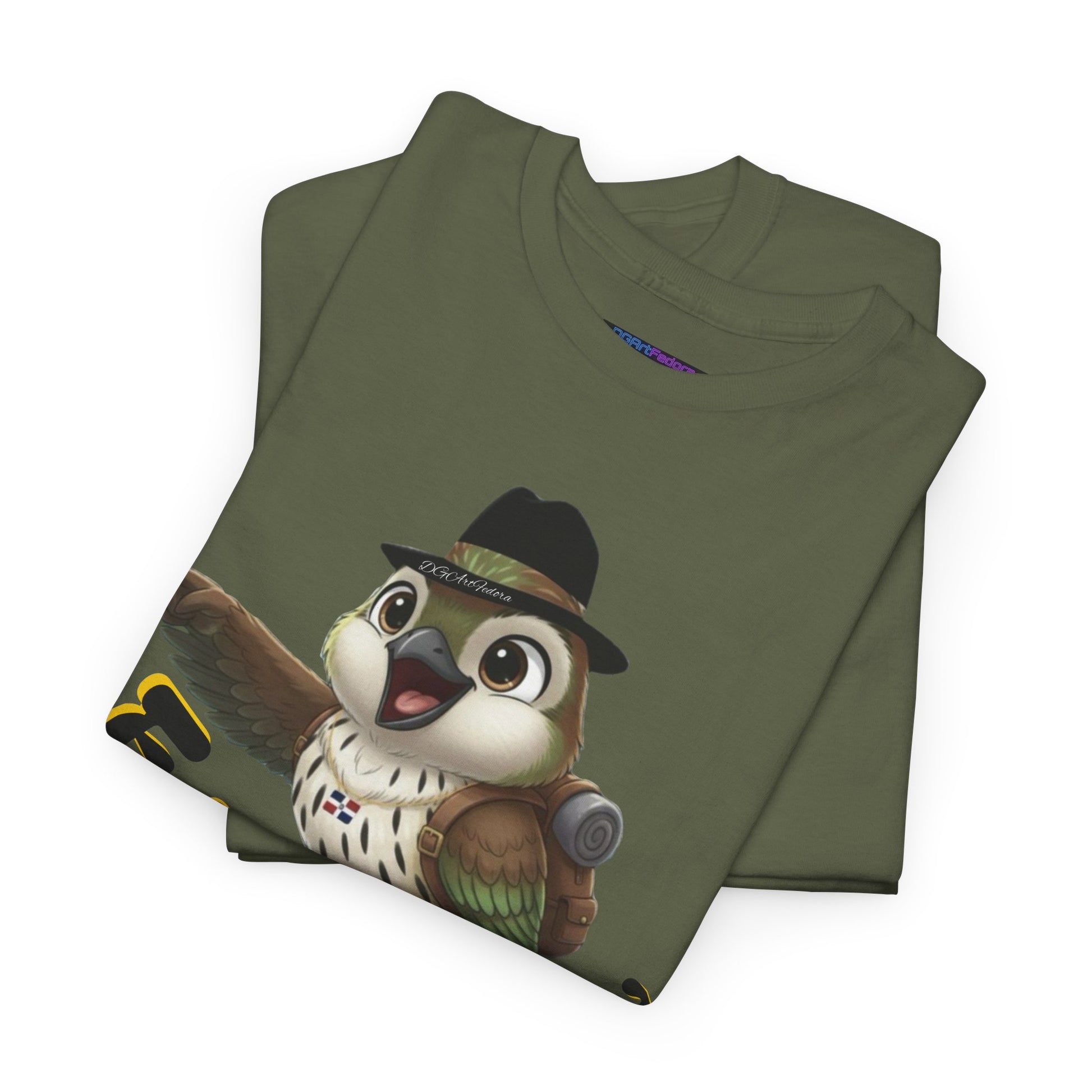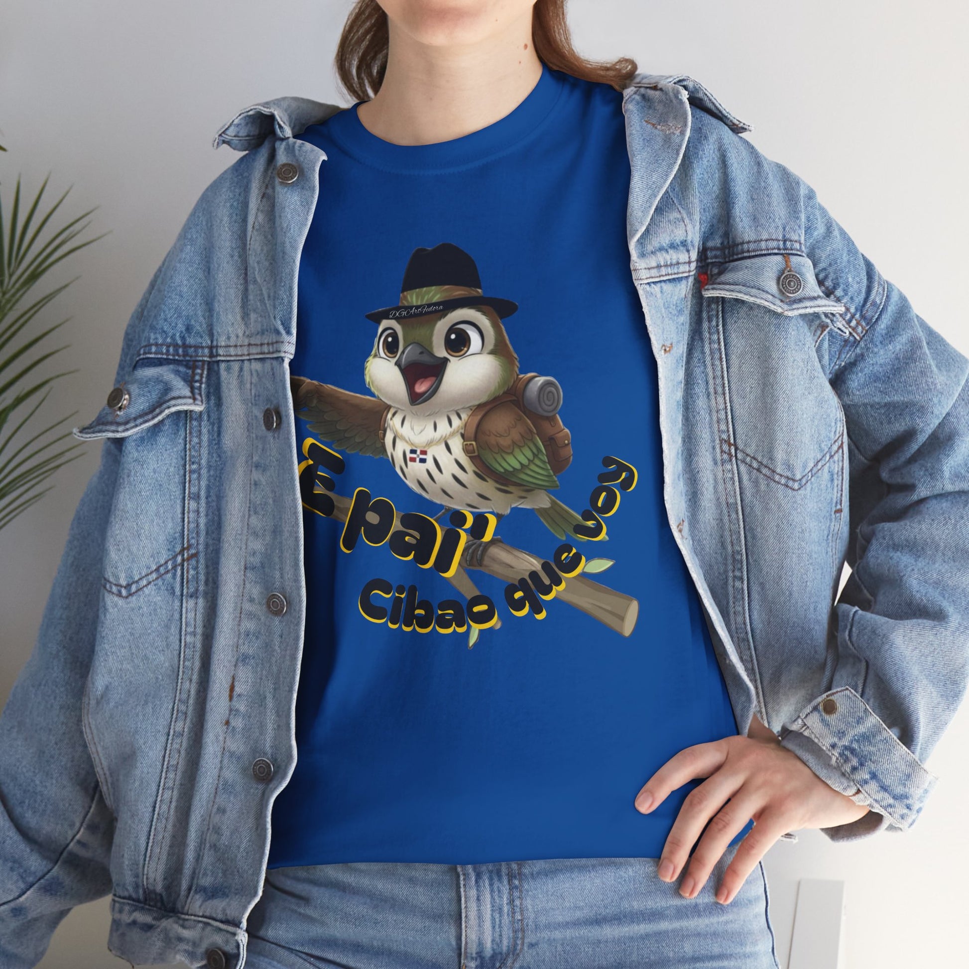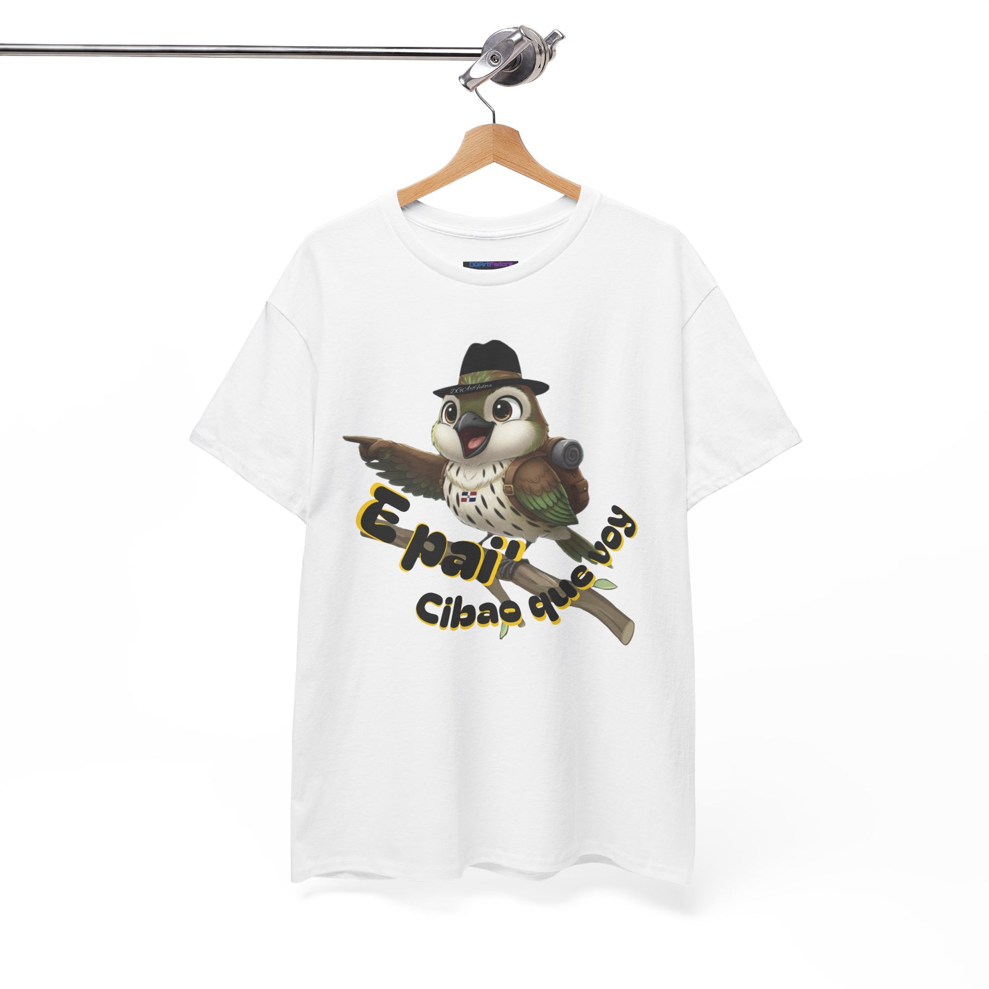 Features exclusive high-definition artwork of Ciguita perched confidently on a branch, wearing her signature hat and chain, and geared up with a hiking backpack. With a jovial expression and one wing outstretched pointing forward, she embodies movement, pride, and purpose. The bold Cibaoan phrase “E pai’ Cibao que voy” anchors the design—a spirited declaration of heading home, forward, and with intention. A dynamic illustration that celebrates Dominican identity, adventure, and regional pride.