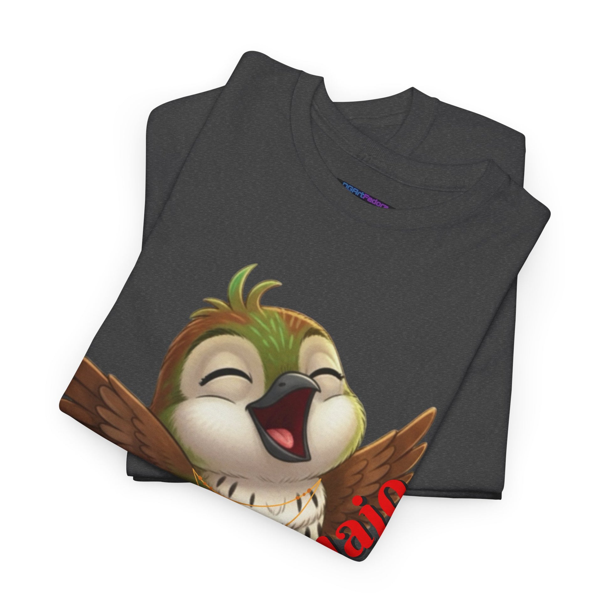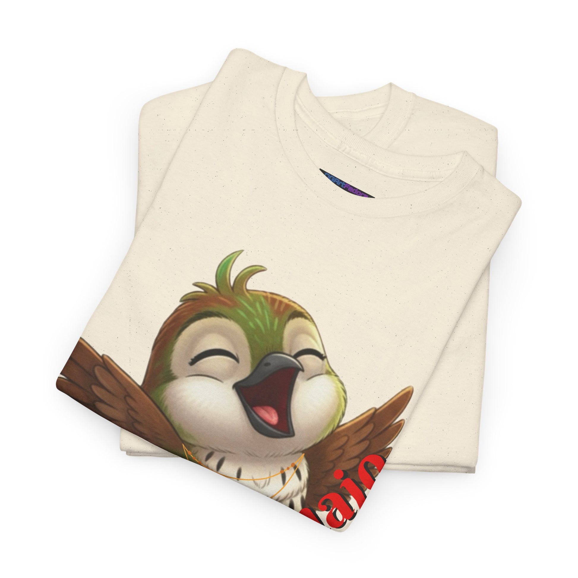 Showcases Ciguita nestled comfortably with outstretched wings, eyes closed in bliss, and a big jovial smile -capturing a moment of pure happiness, free of stress. The playful phrase “¡Ay! Qué Cuajo” (An expression from the Dominican Republic that's like saying Ay! I'don't want to do anything (I don't even wanna get out of bed)) adds a touch of spirited personality and cultural flair, making this design a celebration of boldness and joy.