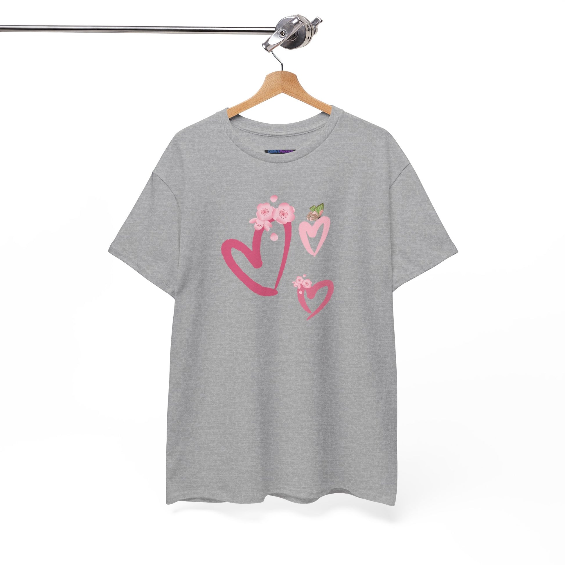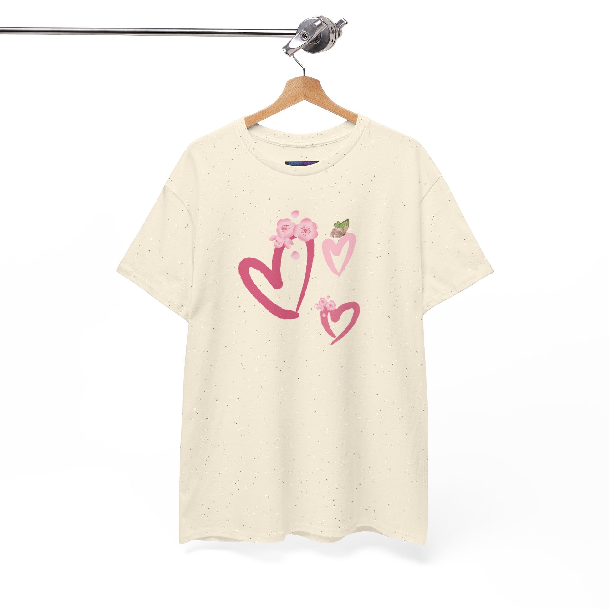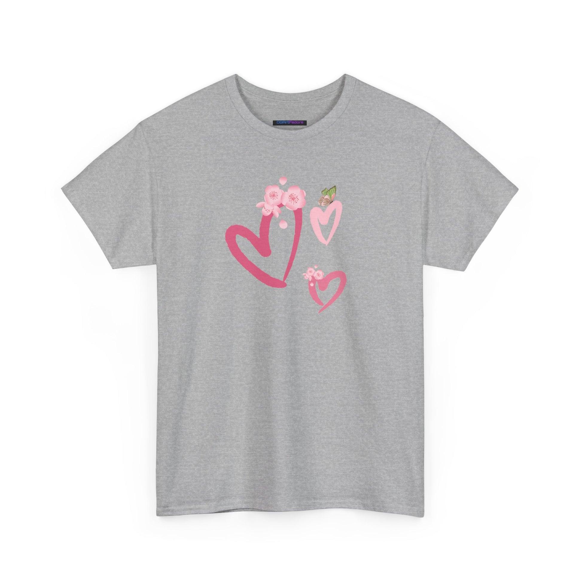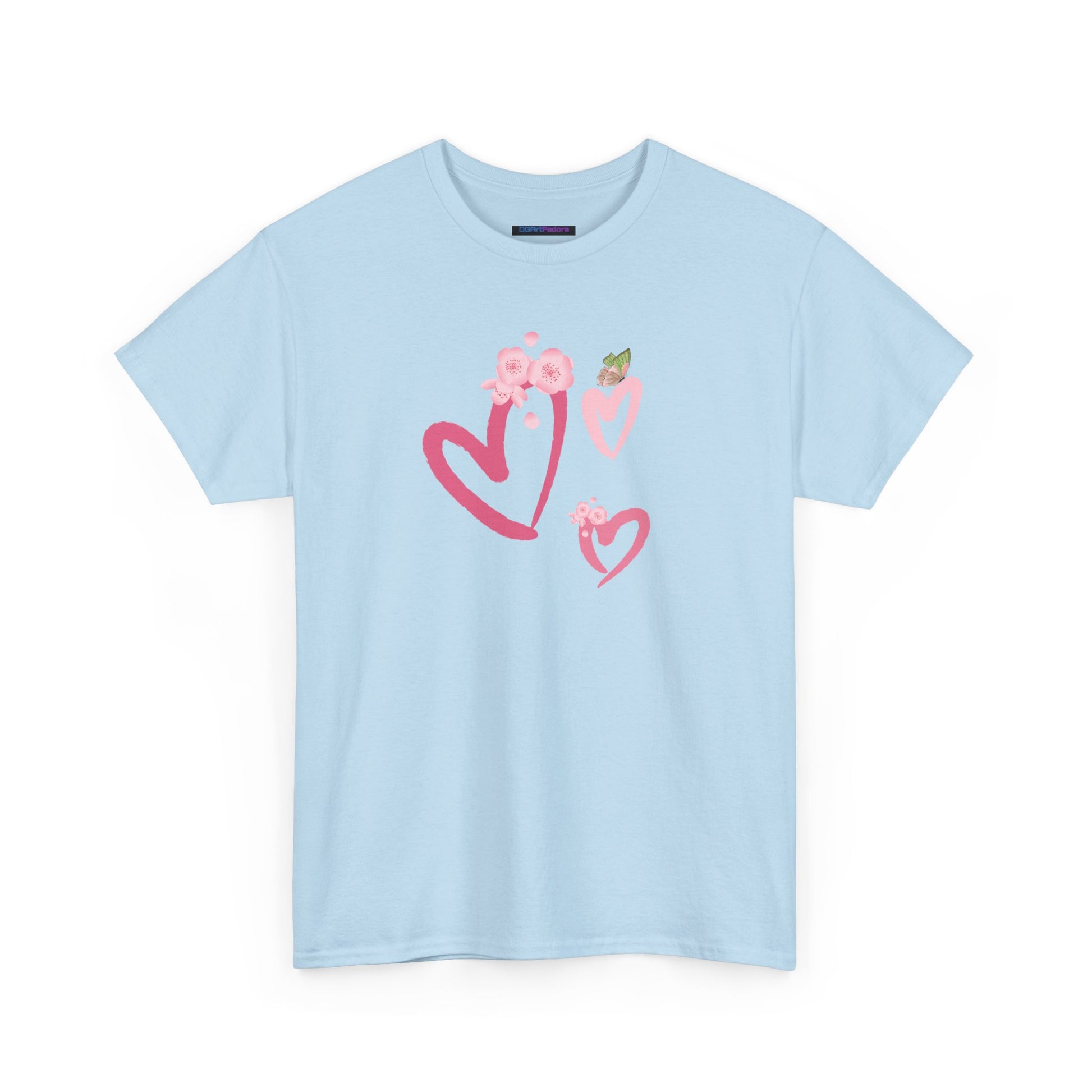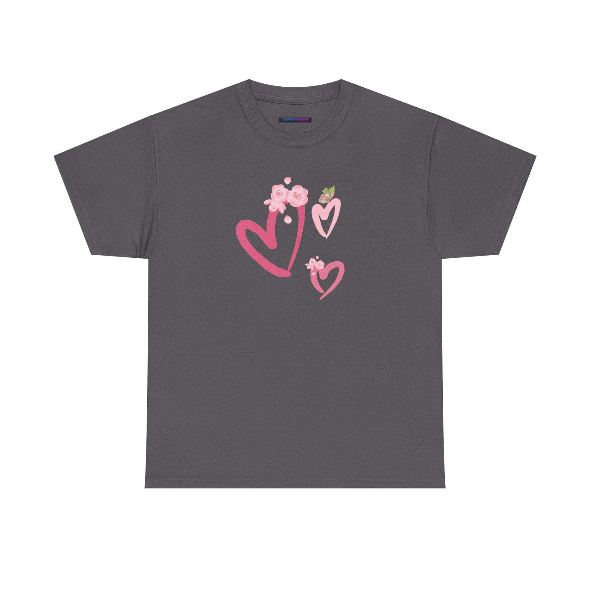 Features three charming hearts—one large and two small—each adorned with nature’s delicate touch. A butterfly rests gently on one small heart, while the others are topped with whimsical flowers, creating a sweet, uplifting design full of life and love.