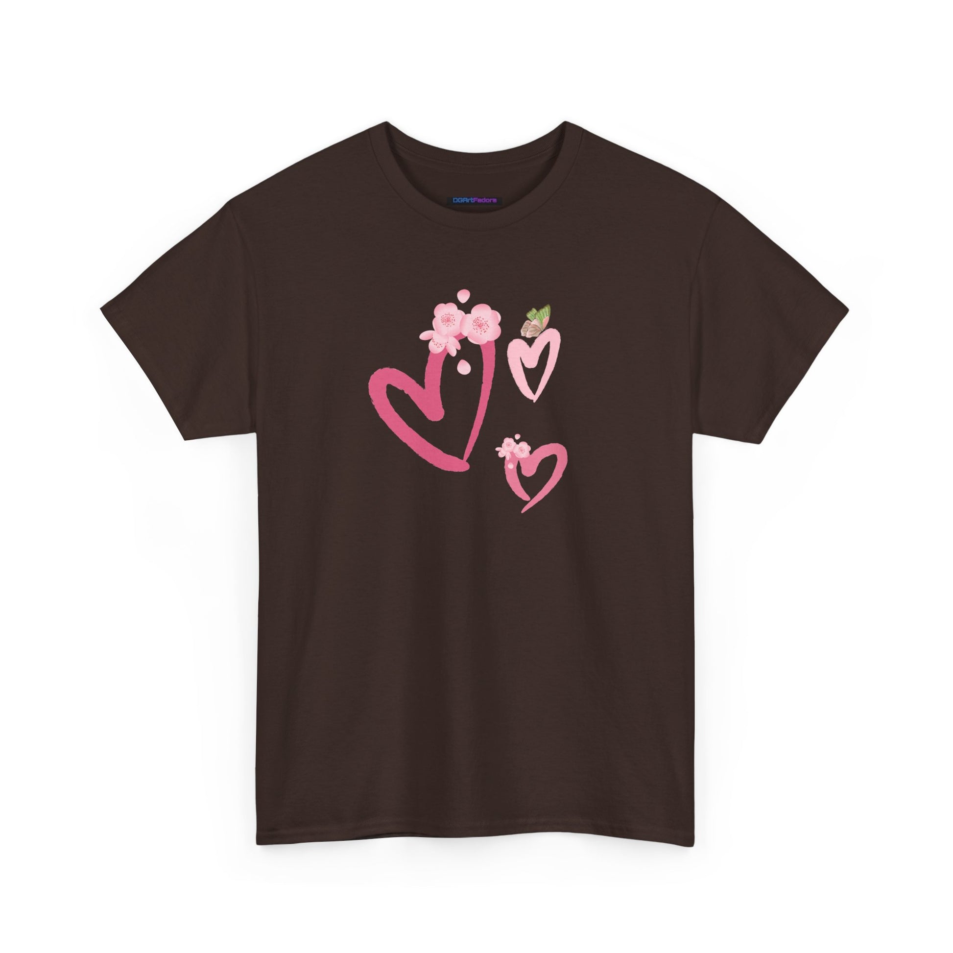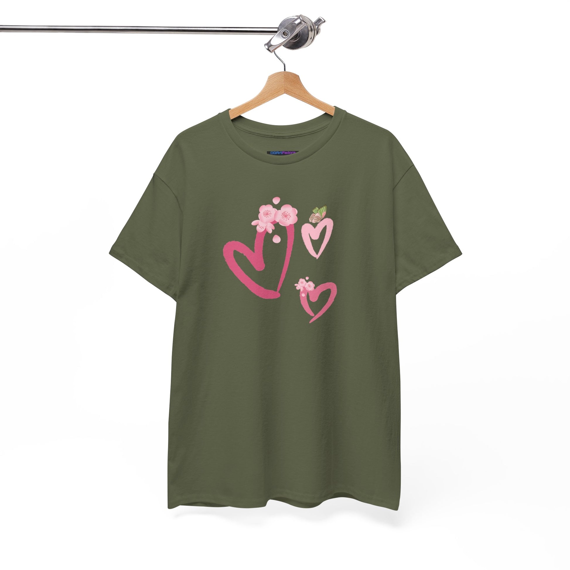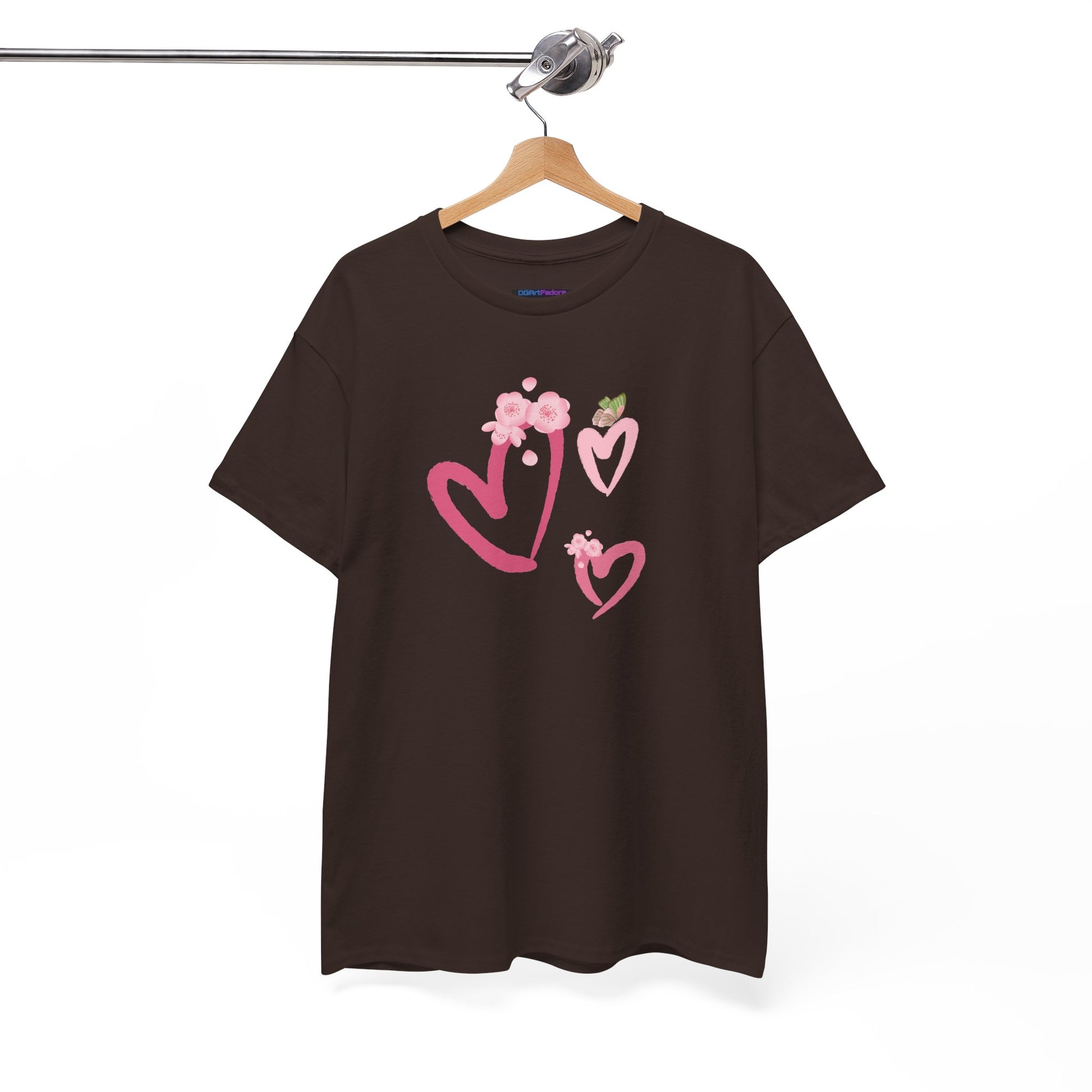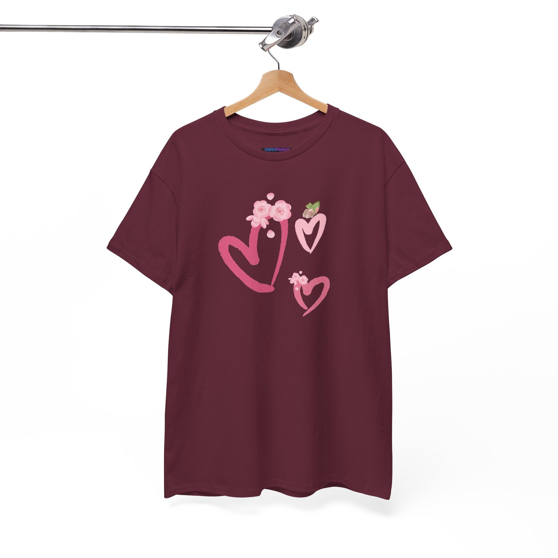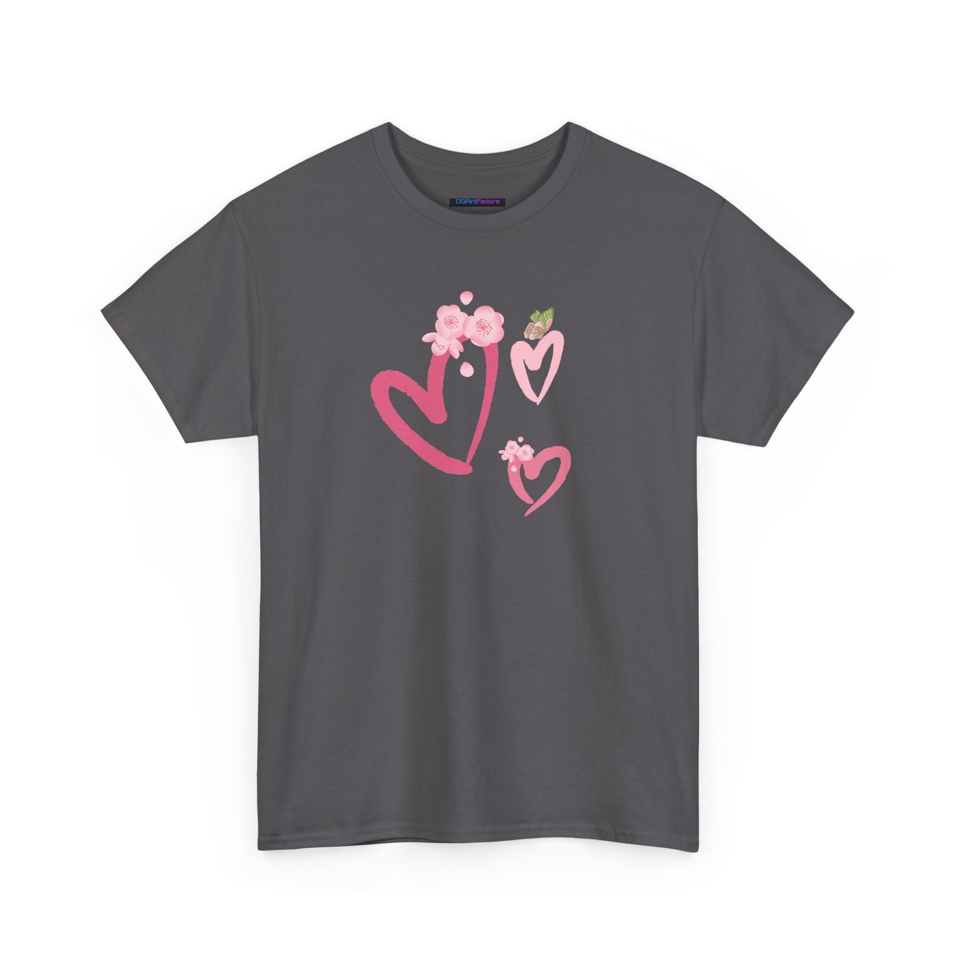 Features three charming hearts—one large and two small—each adorned with nature’s delicate touch. A butterfly rests gently on one small heart, while the others are topped with whimsical flowers, creating a sweet, uplifting design full of life and love.