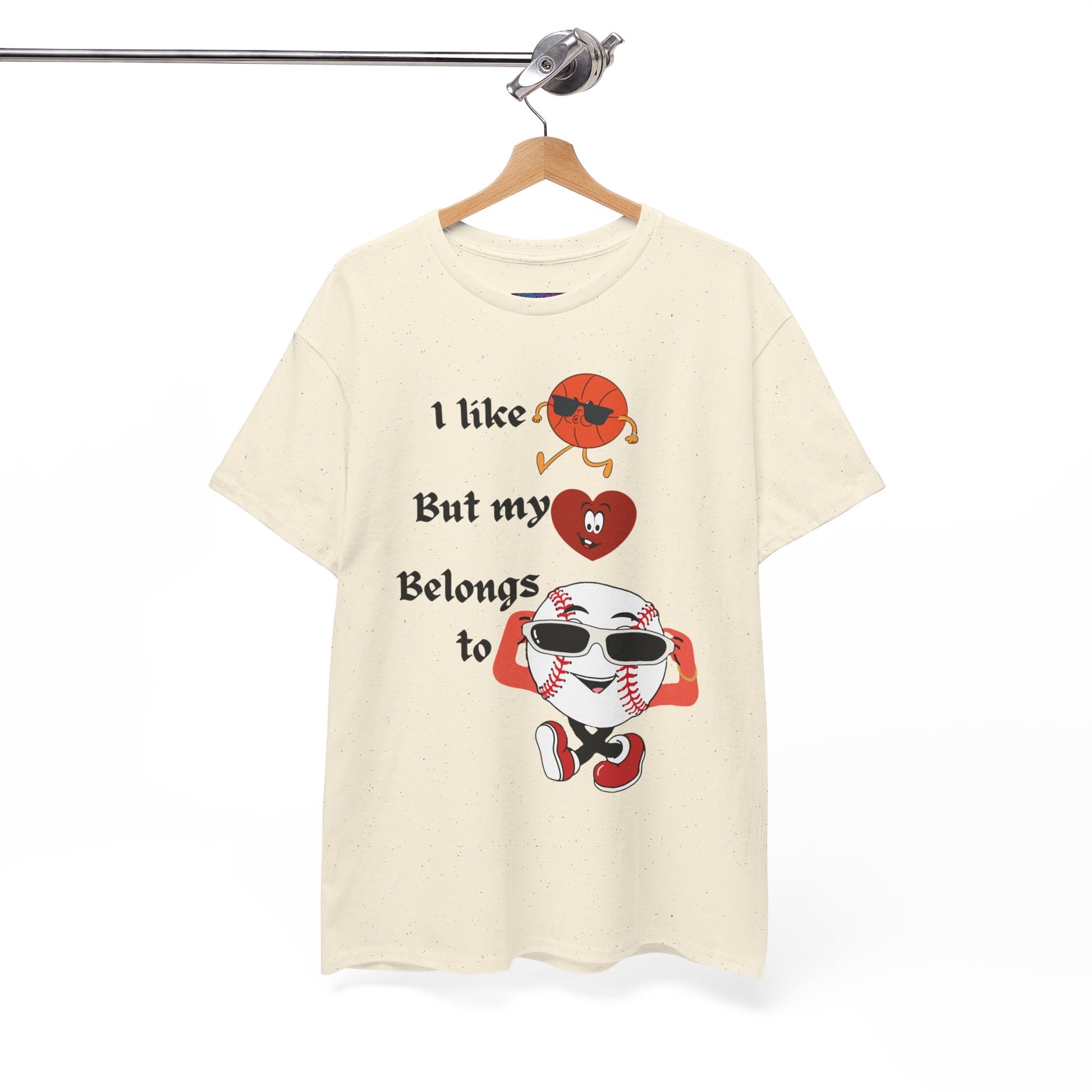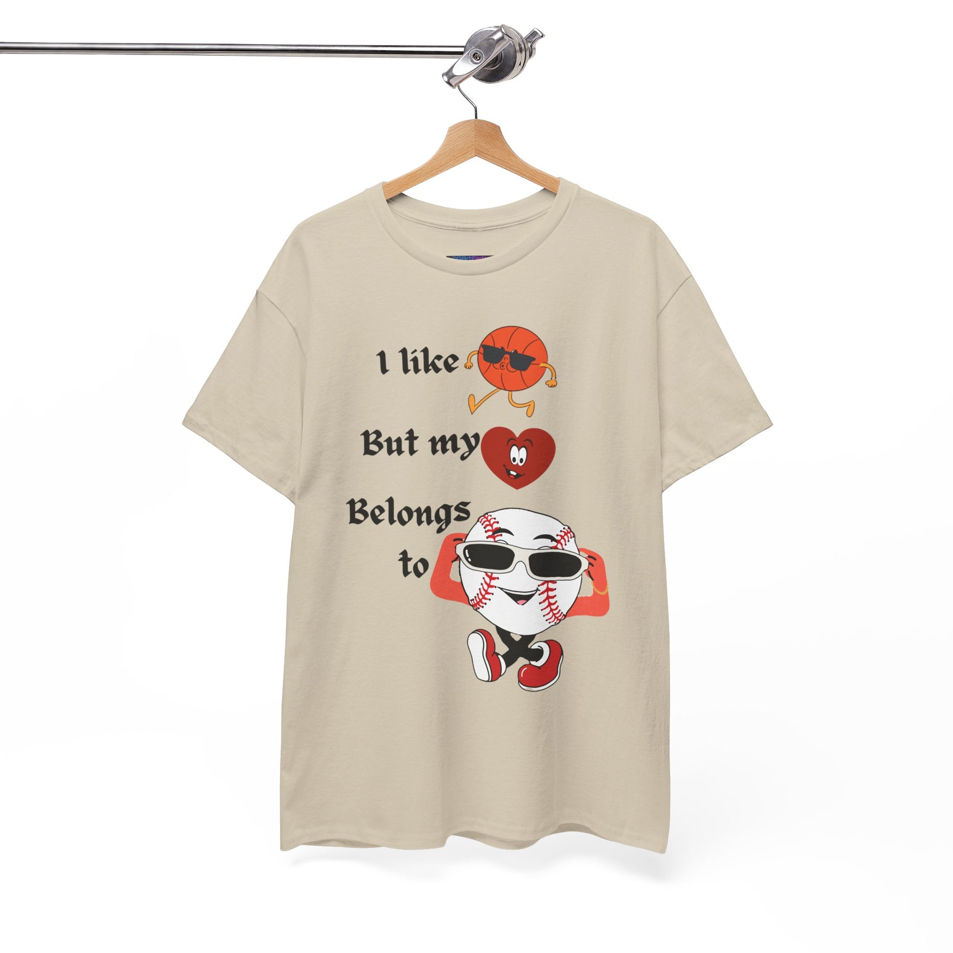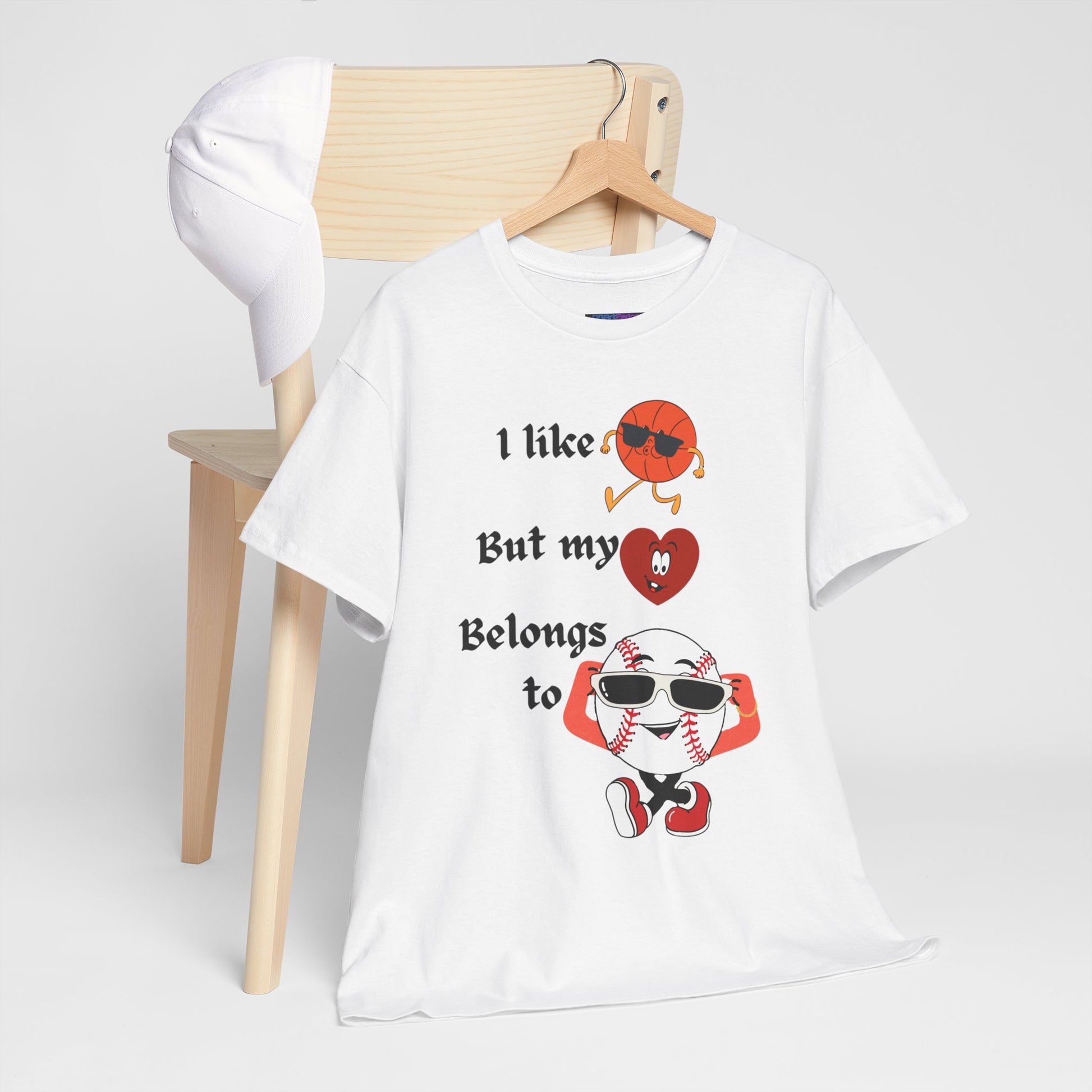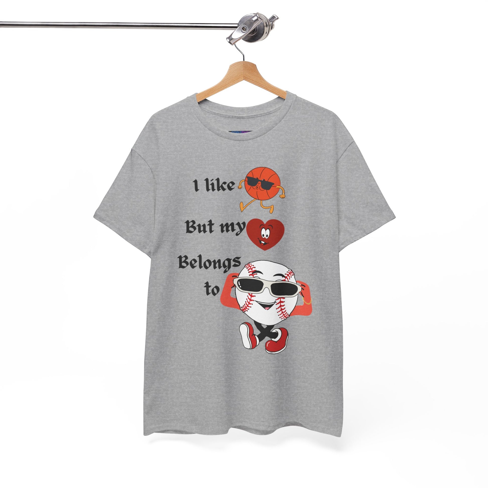 Features a bold, whimsical graphic with the phrase “I like basketball, but my heart belongs to baseball.” The design showcases animated sports characters, including a cool basketball and a confident baseball rocking sunglasses, creating a lighthearted crossover of sports pride and personality. Perfect for sports fans who love both games—but know where their heart truly lies.