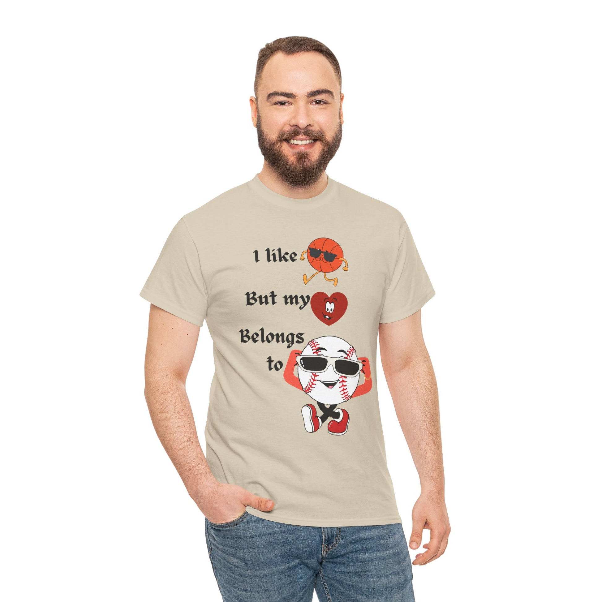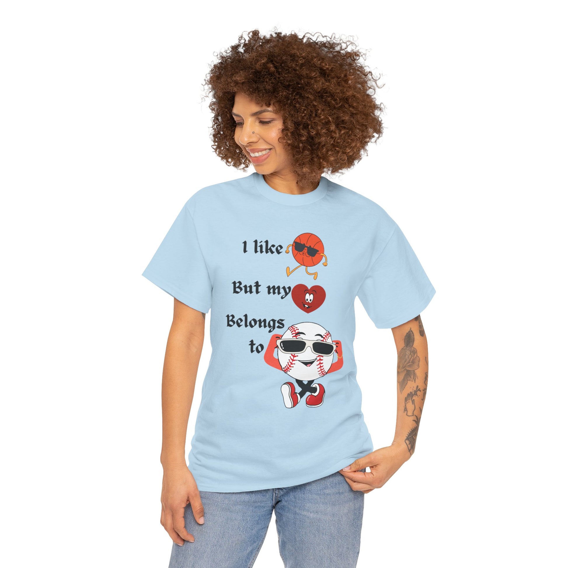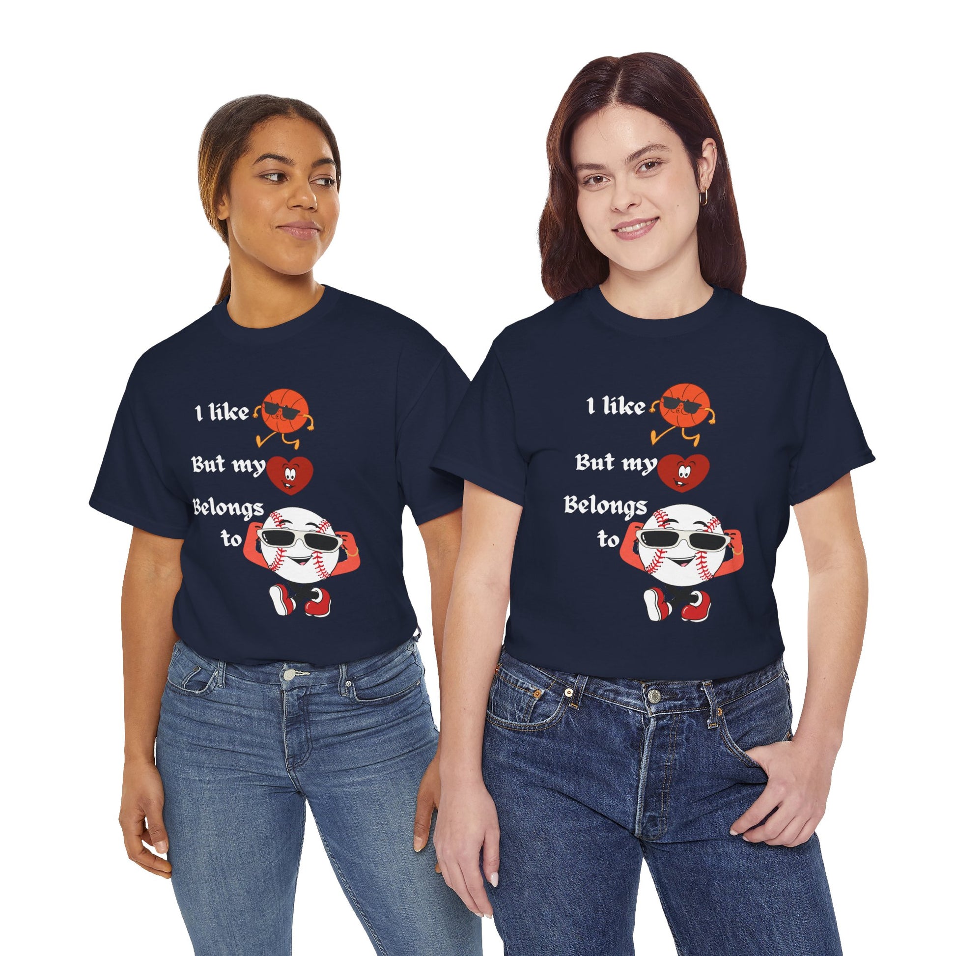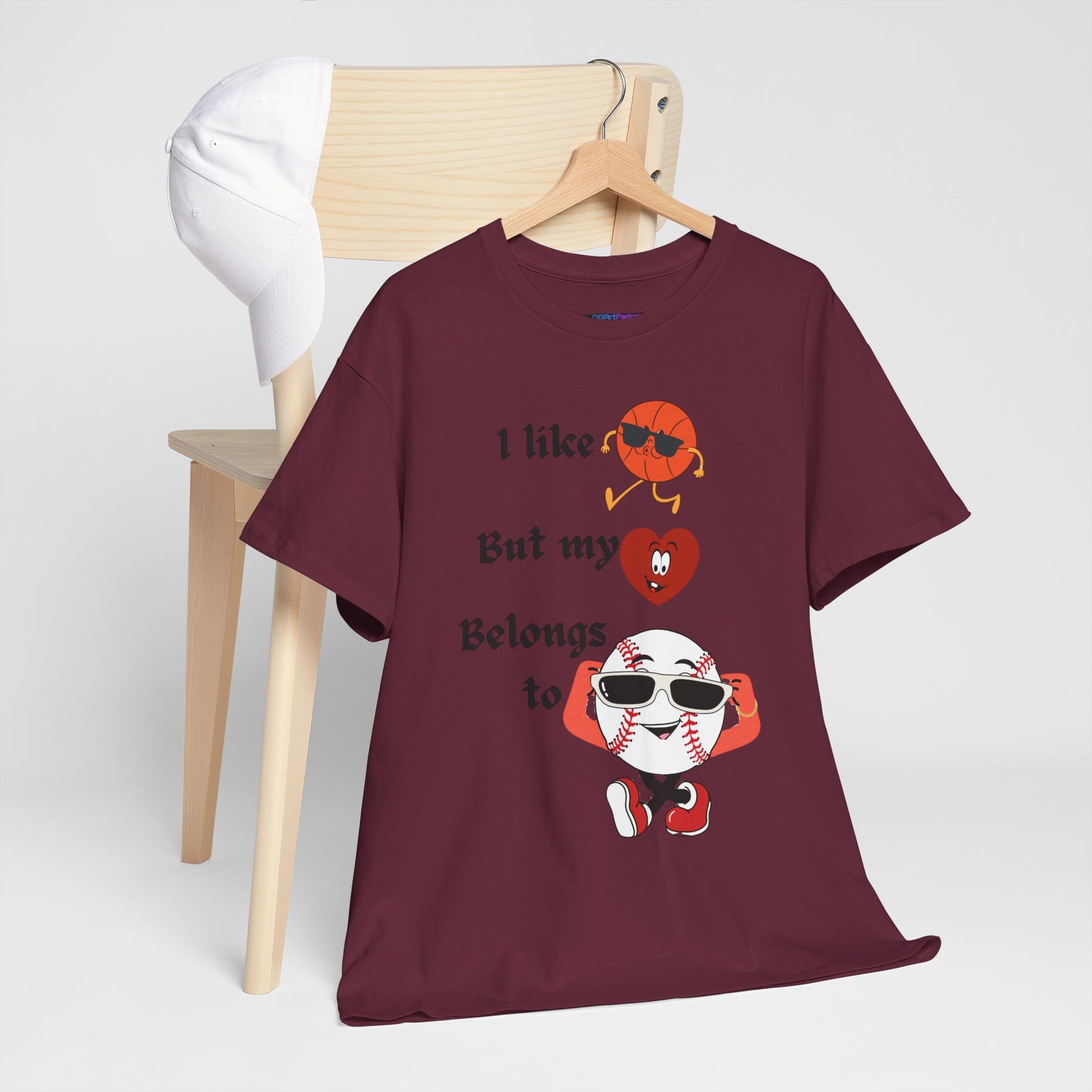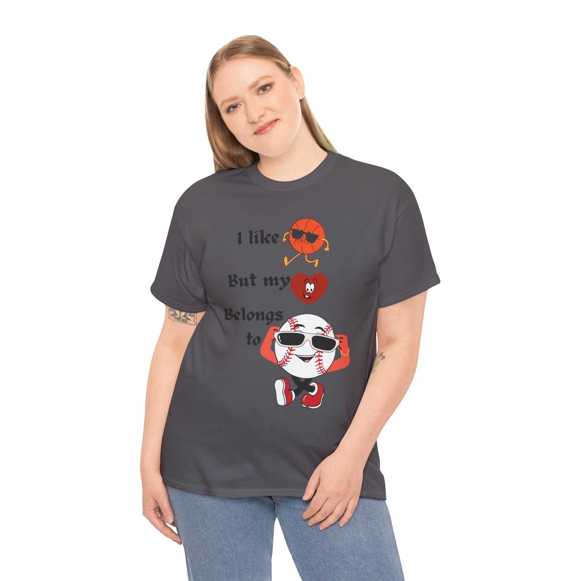 Features a bold, whimsical graphic with the phrase “I like basketball, but my heart belongs to baseball.” The design showcases animated sports characters, including a cool basketball and a confident baseball rocking sunglasses, creating a lighthearted crossover of sports pride and personality. Perfect for sports fans who love both games—but know where their heart truly lies.