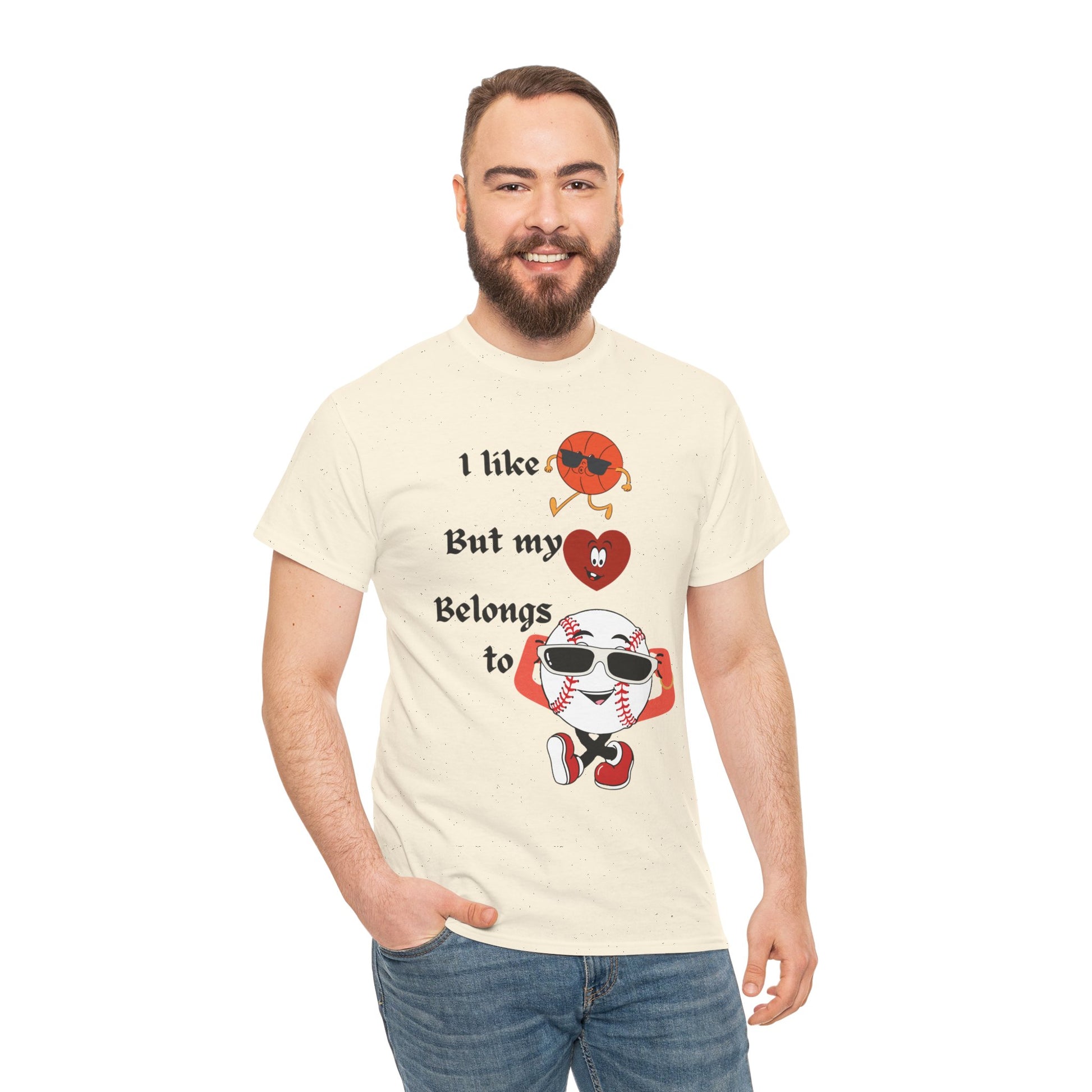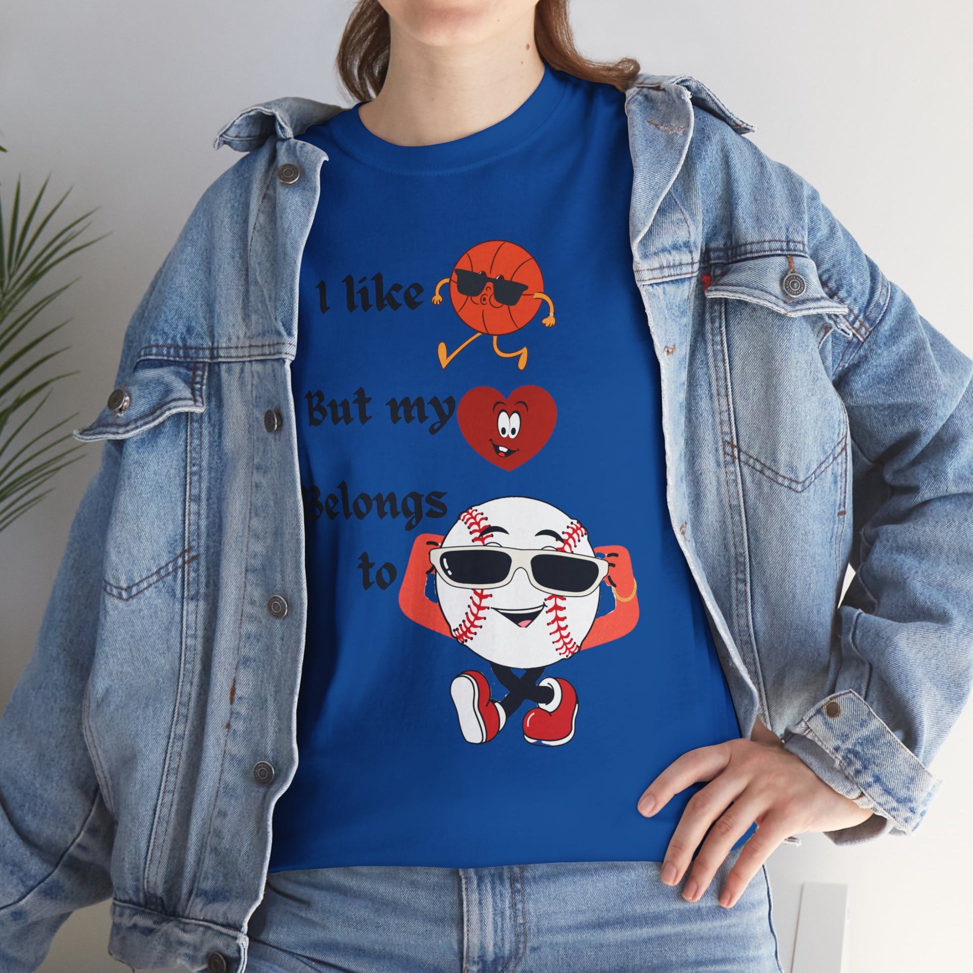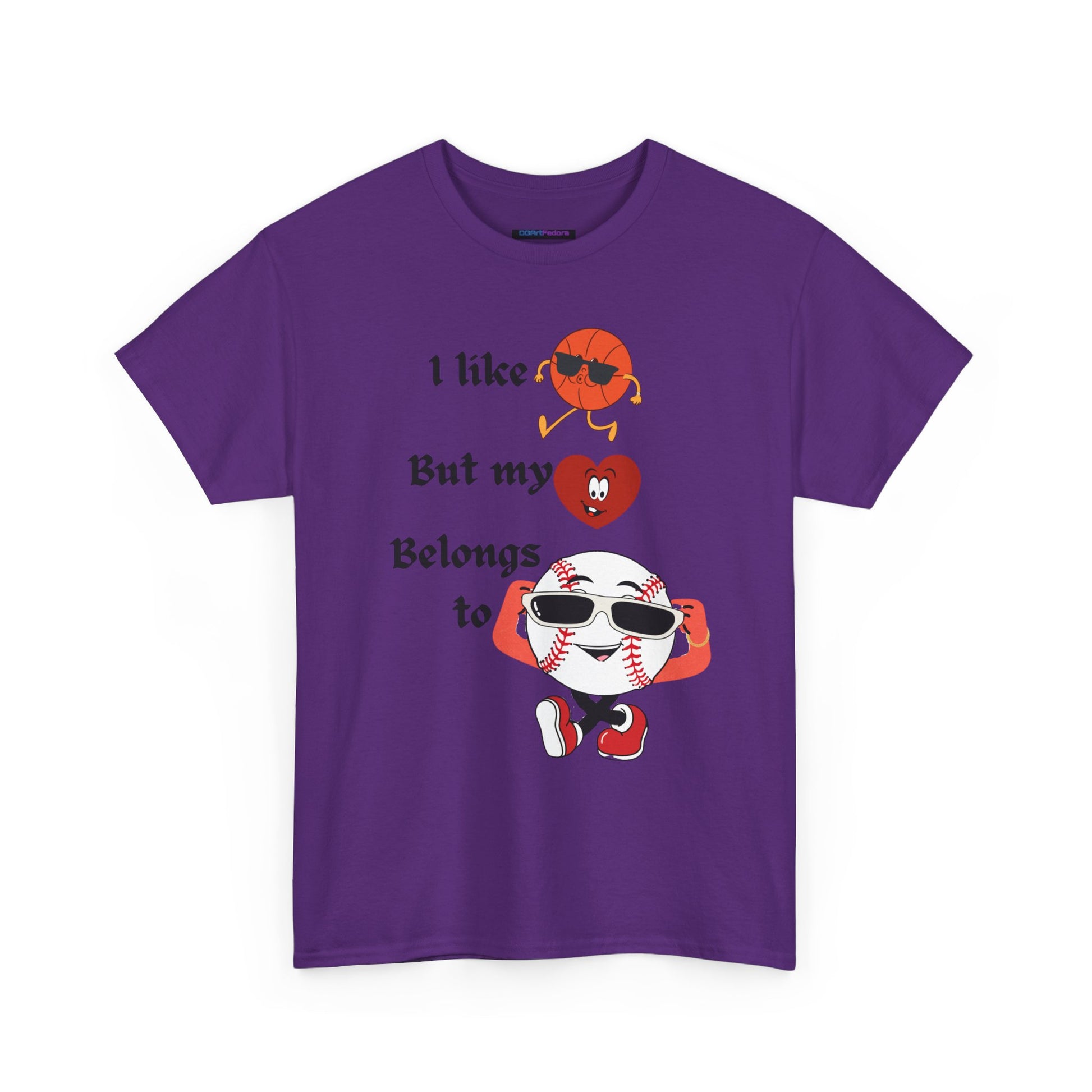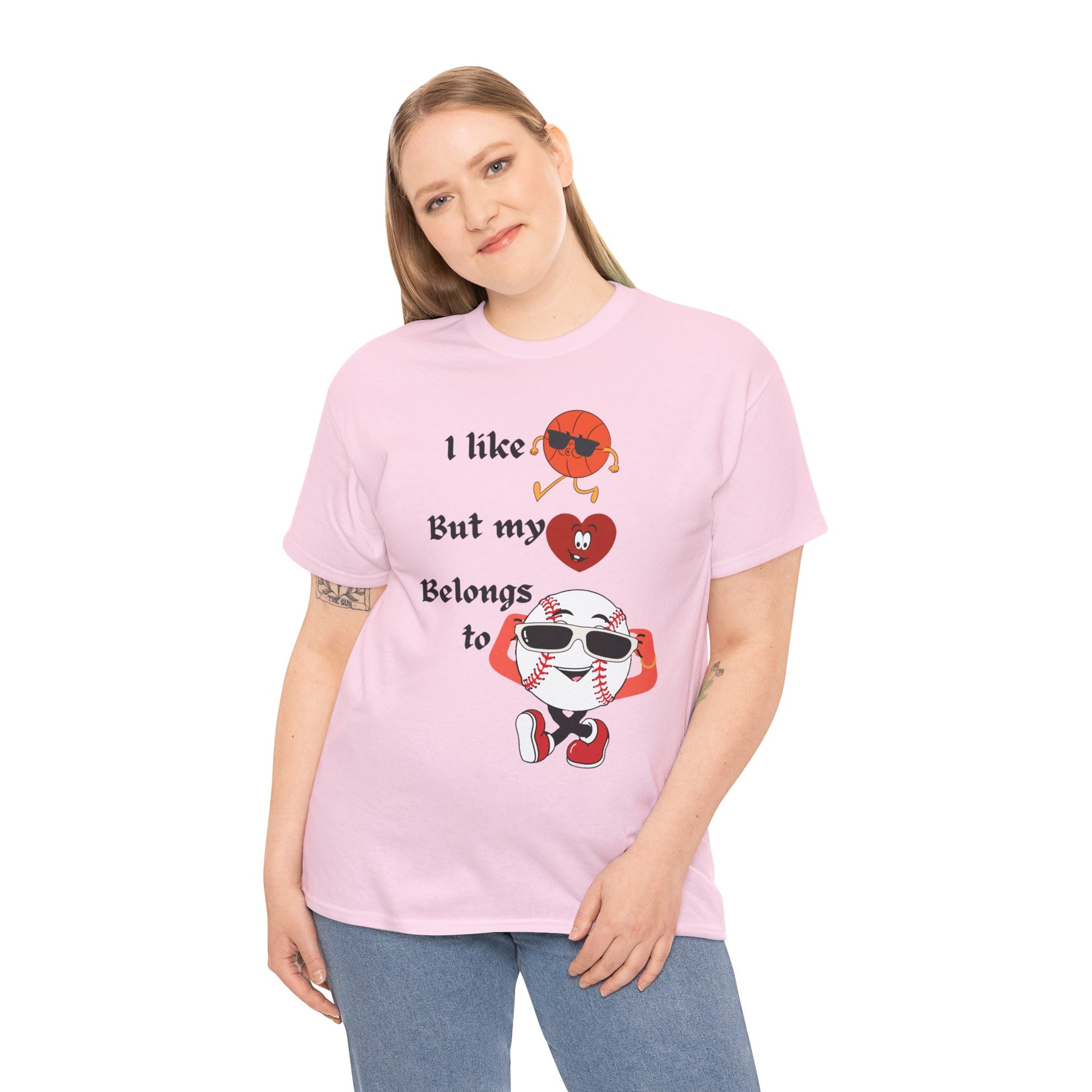 Features a bold, whimsical graphic with the phrase “I like basketball, but my heart belongs to baseball.” The design showcases animated sports characters, including a cool basketball and a confident baseball rocking sunglasses, creating a lighthearted crossover of sports pride and personality. Perfect for sports fans who love both games—but know where their heart truly lies.