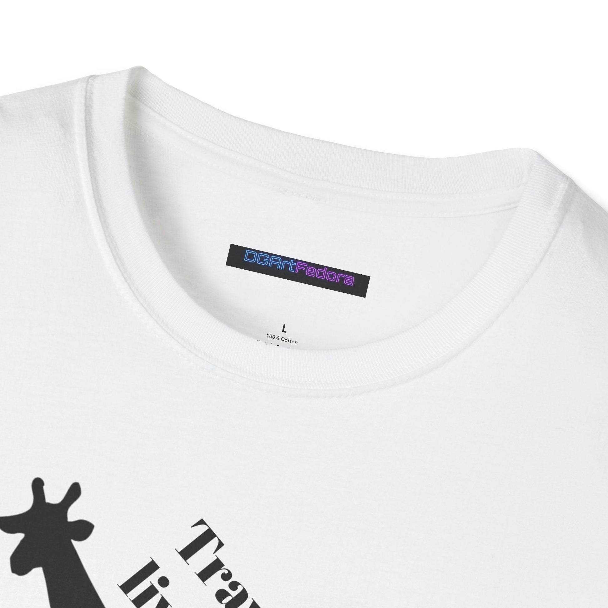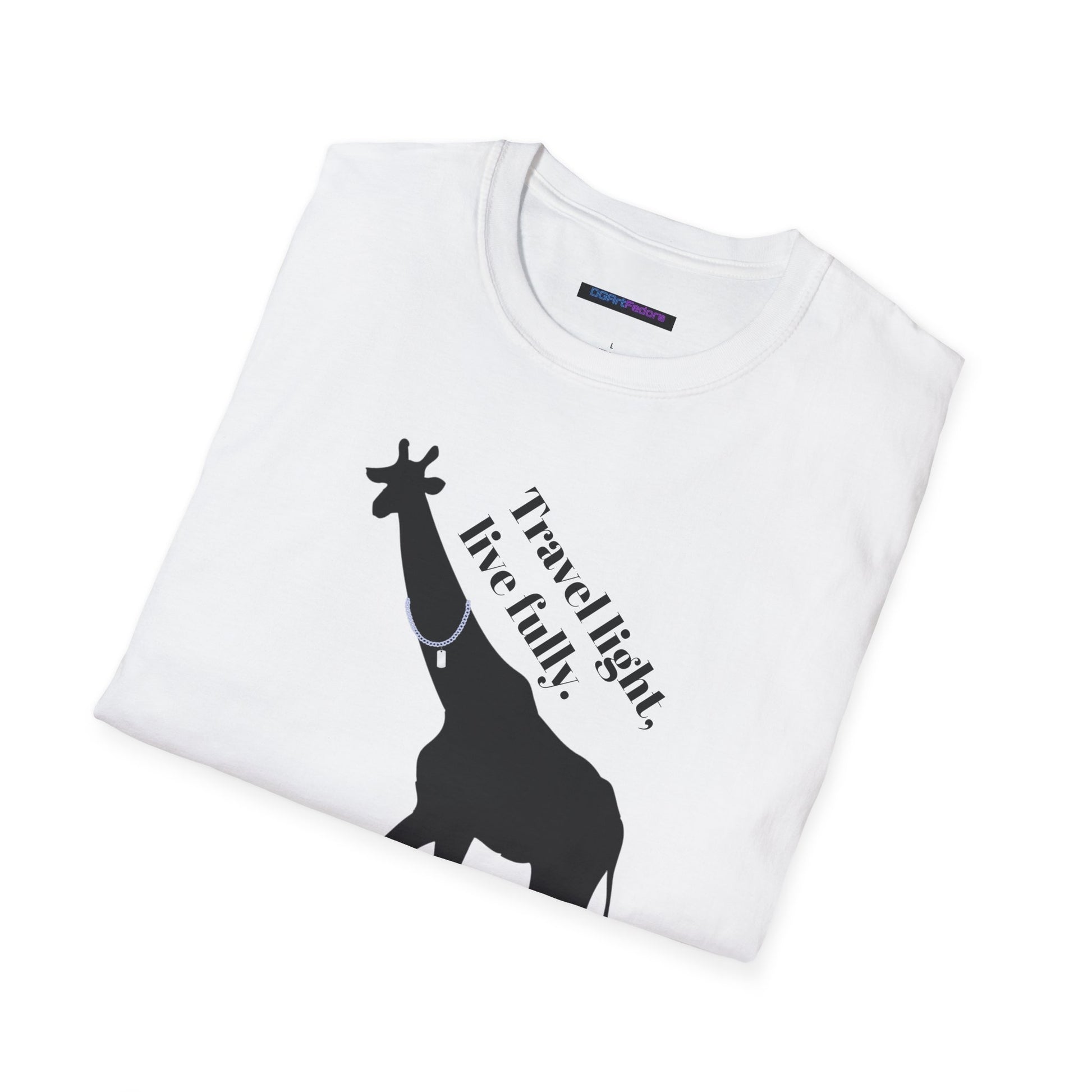 Features a bold black silhouette of a giraffe accented by a necklace, paired with the uplifting phrase “Travel light, live fully.” This design captures the essence of freedom, simplicity, and embracing life’s journey with grace and ease.
